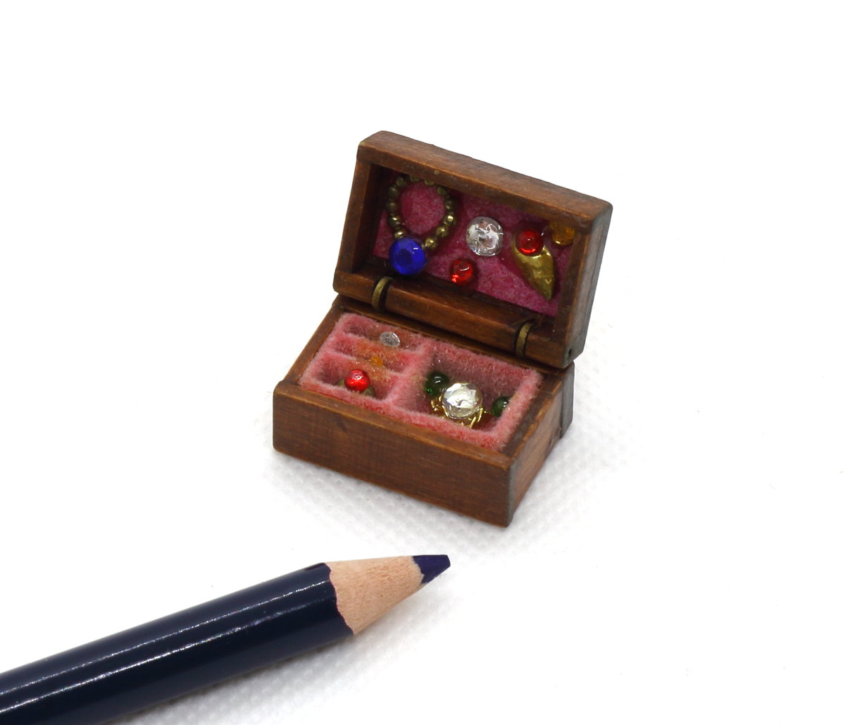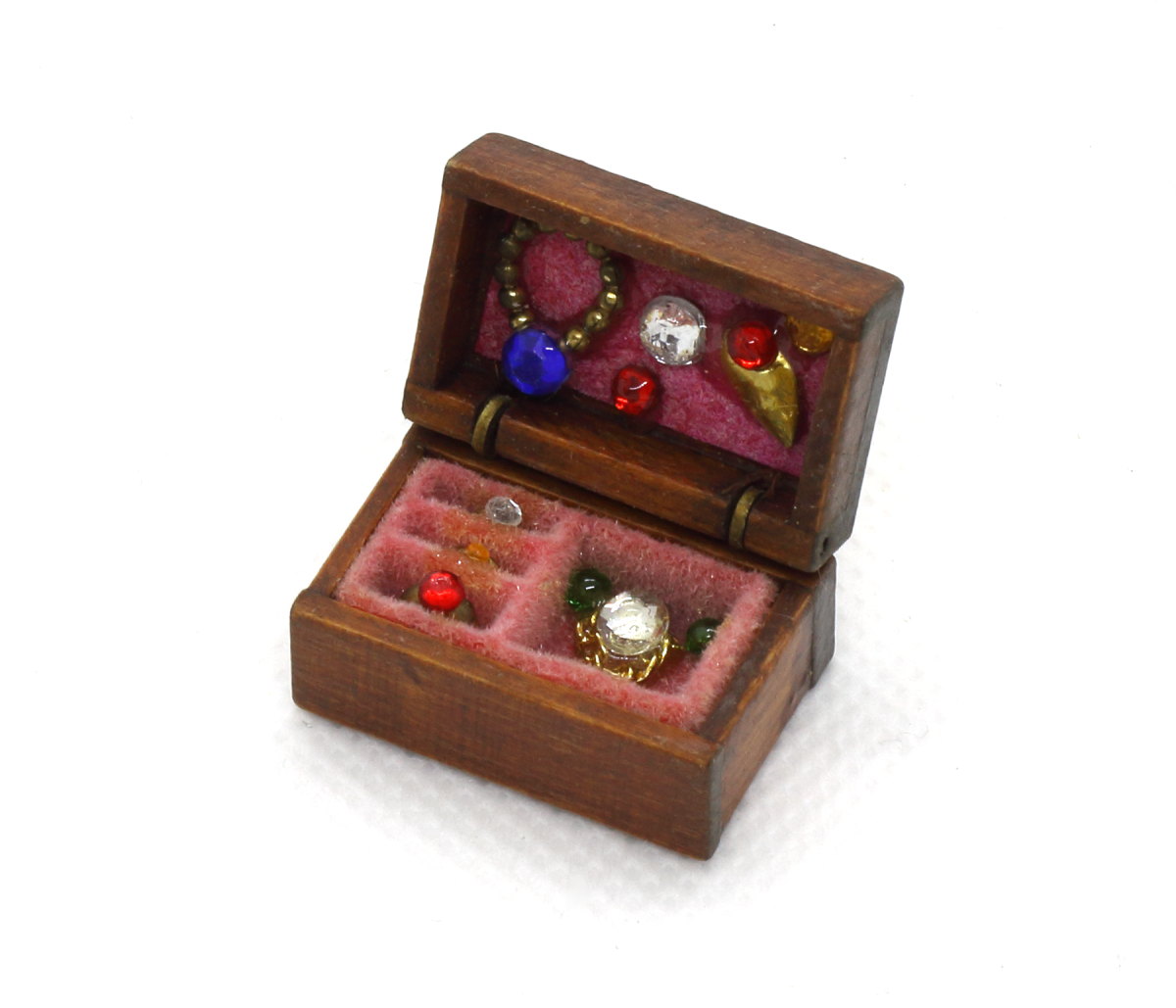 ミニチュアの木箱に入ったジュエリーセット。