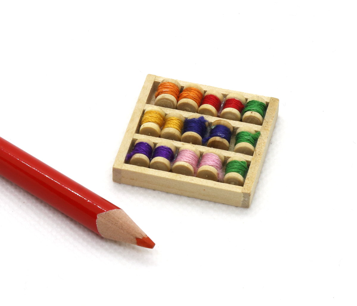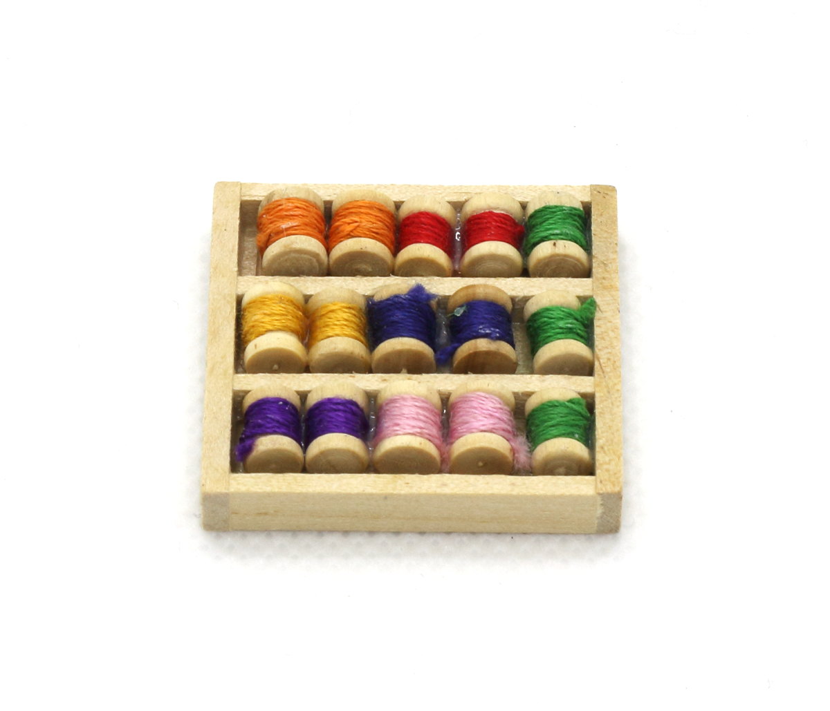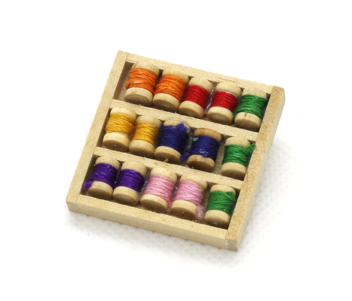 ミニチュアの木箱に入ったミシン糸巻セット。